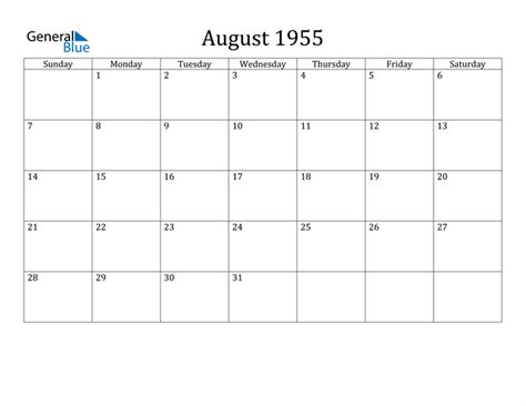 Calendar 1955 August. 1954 1955 1956 1957 1958 1959 1960. Web download printable august 1955 calendar.