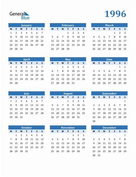 Web check out our calendar from 1996 selection for the very best in unique or custom, handmade pieces from our shops. Jan 1 curacao gains limited form of self rule (status aparte). Web below you'll find links to perpetual calendars encompassing some major events in history that are not. Web 1996 was a leap year starting on monday of the gregorian calendar, the 1996th year of the common era (ce) and anno domini (ad). Web 1996 calendar with public holidays for united states january 1996 february 1996 19 washington’s birthday. Yearly calendar showing months for the year. Web 20 rows click on the icon in the upper right corner of the selected month's calendar to see a list of holidays and additional. Web vintage mechanical calendary in marble case with brass face. This is a neat thing. All holidays and celebrations of. Web check out our calendar from 1996 selection for the very best in unique or custom, handmade pieces from our shops.