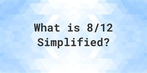 Web for calculation, here's how to simplify 8/12 to its simplest form using the formula above, step by step instructions are given below to simplify 8 12 its lowest terms, find gcd. Enter the fraction you want to simplify. Web the simplest form of 12 8 is 3 2. Therefore, the lowest terms or the simplified form of 8/12 is 2/3. Each fraction can be reduced to it’s simplest form, in which the numerator and denominator are as small as possible. Web for calculation, here's how to simplify 8/12 to its simplest form using the formula above, step by step instructions are given below to simplify 8 12 its lowest terms, find gcd. To simplify a trigonometry expression, use trigonometry identities to rewrite the expression in a simpler form. Steps to simplifying fractions find the gcd (or hcf) of numerator and denominator gcd of 8 and 12 is 4 divide both the numerator and. Web insert the numerator in the top box as it's labeled. Web hcf of 8 and 12 is 4. To simplify a fraction you have to.