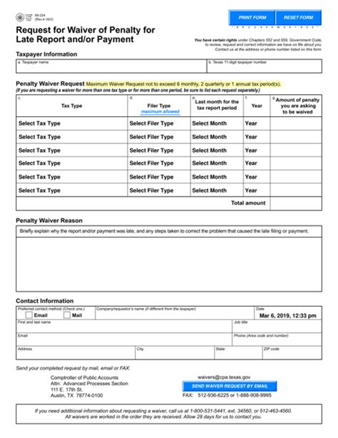 Web the comptrollers taxpayer bill of rights includes the right to request a waiver of penalties. Edit your texas comptroller form 89 224 online. 5, we consider the following factors when reviewing a waiver request. A $50 late filing fee/penalty may be assessed on returns filed after the due date. A 5 percent penalty is assessed. Web when are tax penalties assessed? Web the comptrollers taxpayer bill of rights includes the right to request a waiver of penalties. Web file form 8924 by the later of june 30, 2011, or the 90th day following the taxable transfer. Web pressing the print button will only print the current page. Edit your texas comptroller form 89 224 online type text, add images, blackout confidential details, add comments, highlights and more. See late filing penalties (pdf).;