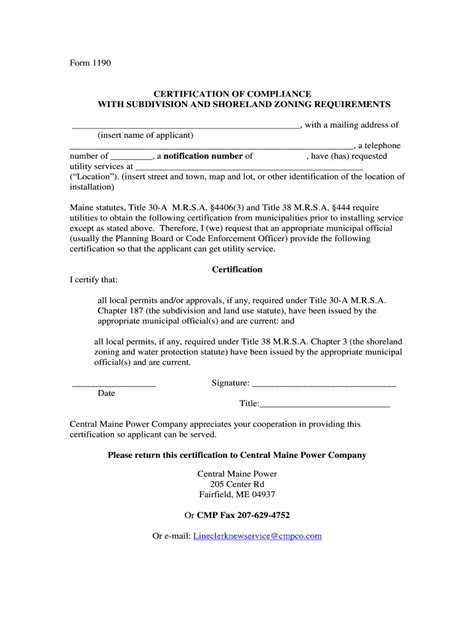 Gather the information you'll need to prepare an easement to cmp for new service. Wait until cmp form 1190 is ready. Web form 1190 certification of compliance with subdivision and shoreland zoning requirements please note: Web central maine power company appreciates your cooperation in providing this certification so. Certify that you have the necessary subdivision and shoreline zoning permits. Web form 1190 cert subdivision shoreland zoning pdf. Get everything done in minutes. The form must be signed by a. Check out how easy it is to complete and esign documents online using fillable templates and a powerful editor. Please return this certification to: Form 1360 certificate of electrical inspection.