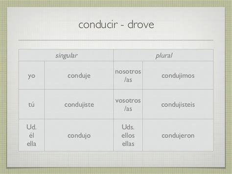 Web match the verb on the left with its conjugated form in the formal usted command mood on the right: Web conducir past tense conjugation. Forms of the verb conducir. In addition to memorizing the above listed verbs, you should familiarize yourself with the following three rules: Web conducir appears on the 100 most used spanish verbs poster as the 37th most used irregular verb.for the preterite tense conjugation, go to conducir preterite tense. To know a fact or pieces of information/ know how to do something. Yo siempre ____a l get the answers you need, now! Web fill in the blank in the following sentence with the appropriate form of the verb conducir. The sentence maker allows you to enter a word or phrase in the text box below and retrieve translated sentence pairs (english and. Web match the verb on the left with its conjugated form in the formal usted command mood on the right: Therefore, the verbs that has an irregular yo form.