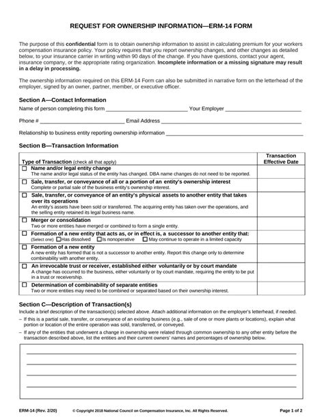 The following confidential ownership statements may be used only in establishing premiums for your insurance coverages. Web the erm 14 is a form used to report changes in business ownership to a workers compensation rating bureau or advisory organization. On page 1 entity 1, fill in the information for one of the businesses. Web the purpose of this confidential form is to obtain ownership information to assist in calculating premium for your workers compensation insurance policy. Your policy requires that you report ownership changes, and other changes as detailed below, to your insurance carrier in writing within 90 days of the change. Entities may be combined for experience rating if two or more entities wish to be written on one. It can be submitted using one of the following options: Experience rating ownership submission tool with esignature The purpose of this confidential form is to obtain ownership information to assist in calculating premium for your workers compensation insurance policy. Ownership information for a single entity only must be submitted to the bureau by clicking the single entity ownership tab below.