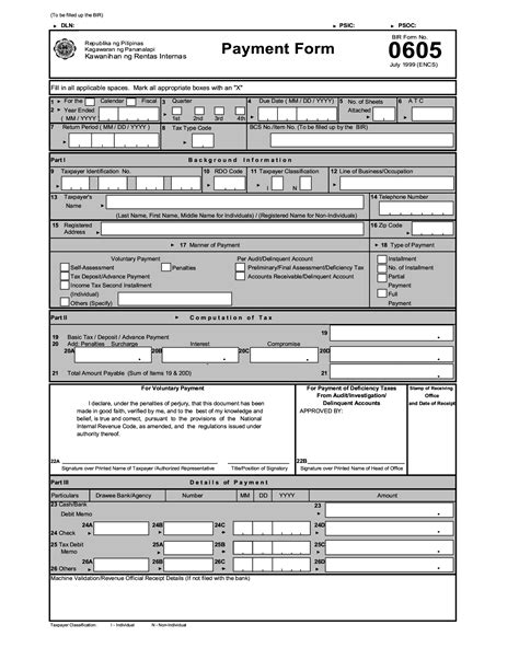 Web every taxpayer shall use this form, in triplicate, to pay taxes and fees which do not require the use of a tax return such as second installment payment for income tax, deficiency. Kagawaran ng pananalapi kawanihan ng rentas internas 0605 july 1999 (encs) (to be filled up the bir)annex b dln: Cocodoc is the best platform for you to go, offering you a great and easy to edit version of bir form 0605 as you desire. Web efps option page for form 0605. Click on the download link and set up ebirforms on your computer 3. There are two methods in completing a tax form for submission in the efps: This bir form is to be accomplished every time a taxpayer pays taxes and fees which do not require the use of a tax return such as second installment. Use ebirform or download the form. Web the bir issued this form that needs to be accomplished every time a taxpayer pays taxes and fees that don’t require the use of tax returns. Web view, download and print bir no.