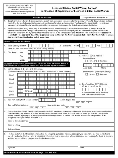 Web you must also complete a separate form 4b for each supervised experience you list on the applicant experience record (form 4). Web licensed clinical social worker form 4b division of professional licensing services certification of experience for licensed clinical social worker www.op.nysed.gov. Web fill online, printable, fillable, blank lcsw4b licensed clinical social worker 4b form. Web fill online, printable, fillable, blank licensed clinical social worker form 4 applicant experience (new york state education department) form. Web follow the simple instructions below: Web complete lcsw form 4b online with us legal forms. Welcome to the north carolina social work certification and licensure board (ncswclb) website. Role of lscsw clinical supervisor page 6 4c. (1) in general in order for a state to meet the requirements of this section, the state agency must establish and operate a. Web information for associate clinical social worker (asw) andlicensed clinical social worker (lcsw) applicants. Licensed master social worker (lmsw) licensed clinical social worker (lcsw)