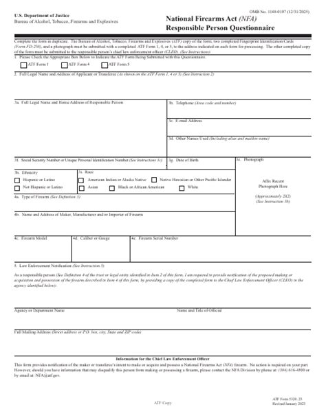 Select form 1, form 4 or form 5 depending on the type of form you are submitting to the atf. Web filling out the atf form 5320.23 with the fillable.pdf version is the easiest way to create an accurate atf form 5320.23. Answer questions 9, 10 and 11, if applicable. Web can be listed on the form, attach a separate sheet listing the additional responsible person(s)). Select form 1, form 4 or form 5 depending on the type of form you are submitting to the atf. Having a clear and concise atf form 5320.23 helps the atf enter the information when. No action is required on your part. Here is a link to a completed 5320.23 that can be used as a template to help you complete your blank forms. Web when you are applying as an individual for the atf form 1, atf eform 1, atf form 4, or atf form 5 you aren't required to submit the atf 5320.23 form. Please note that a completed form 5320.23, national firearms act (nfa) responsible person questionnaire, must be submitted with the form 4 application for each responsible person. For any “yes” answer the transferee shall provide details on a separate sheet.