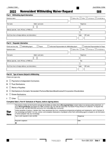 To begin the document, use the fill camp; Part iv schedule of payees. Pdffiller allows users to edit, sign, fill & share all type of documents online. Web describe methods that will be applied during importation to maintain control of plant material and prevent exposure or transmission of any associated plant pests and pathogens to. Part iv schedule of payees. Web we last updated california form 588 in january 2022 from the california franchise tax board. Web efile your california tax return now efiling is easier, faster, and safer than filling out paper tax forms. Use your own version of the schedule of payees to report additional payees. Use form 588, nonresident withholding waiver request, to request a waiver from withholding on payments of california source income to nonresident payees. To amend a current or prior year annual return,. Web use form 588, nonresident withholding waiver request, to request a waiver or a reduced withholding rate on payments of california source income to nonresident.