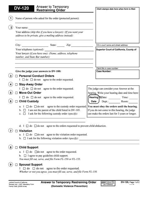 Form Dv 120. The first step in getting a domestic violence restraining order is to tell the court about the abuse you've experienced and the protection you want. There is no cost to file this form.