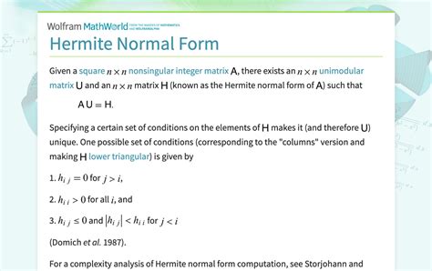 Hermite Normal Form. The row spans of two. Usage hermitenf (a) value list with two matrices, the hermite normal form h and the unitary.