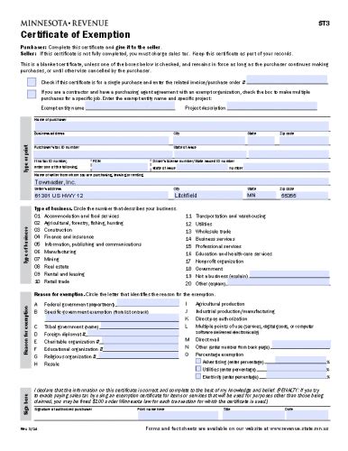 Web minnesota or local taxing area. If this certificate is not completed, you must charge sales tax. Please work with the hotel, merchant, or vendor to. See the form st3 instructions. Sell items that are exempt by law; Web 09 rental and leasing 10 retail trade reason for exemption. Sign it in a few clicks. See the form st3 instructions and exemption descriptions for more information about the. A federal government (department) b specific government exemption (from list on back) c tribal government. Web minnesota or local taxing area.