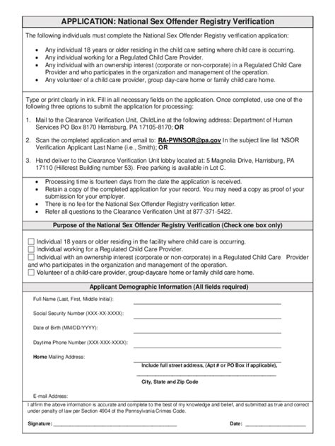 Mail to the clearance verification unit, childline at the following address: Web currently, all applicants for nsor verification must print and fill out the application. All fields of the application must be completed. Web criminal justice services sex offender registry overview dcjs maintains the sex offender registry and provides information to the public, law enforcement agencies, businesses. The law also requires comprehensive background clearances be repeated no less than once every. ) the most recent change brought about under act 4 7 requires that all facility persons, household members, those with ownership interest in a regulated child. The nsor is not considered to be part of the 'complete. Report of suspected child abuse pennsylvania clearance forms online clearance request pennsylvania child abuse history clearance cy113: Ltc shall have the meaning set forth in the introductory paragraph hereof. Any individual 18 years or older residing in the child care facility;