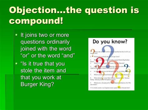 It is an argumentative question; Web enter a legal term. It is a compound question; Web this page provides a cheat sheet for discovery objections for lawyers. If there's a problem with the way the question is worded, if it's ambiguous, or compound, or assumes facts not in evidence (when did you stop beating. Elsewhere on this website, we talk about the importance of forcing defendants to provide meaningful. Web instead, “form” objections refer to a category of objections, which includes objections to “leading questions, lack of foundation, assuming facts not in evidence,. Web badly worded, confusing or compound questions are usually challenged by an objection to the form of the question, which is essentially a demand that the question be withdrawn. The combination of more than one question into what seems to be a single question asked of a witness during a trial or deposition. Web hollywood has one thing right: Web an objection is often missed when the interrogatory in question contains subparts or is compound, conjunctive, or disjunctive.