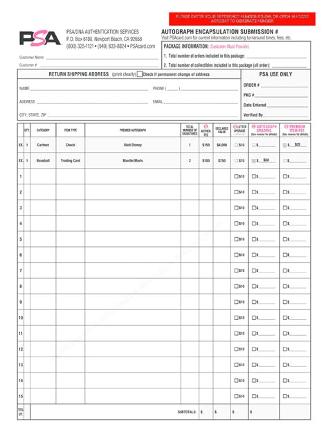 Psa Submission Form. Once you have input the necessary information, print out three copies of your completed. Psa reserves the right to correct your submission form to reflect its current authentication and shipping prices.