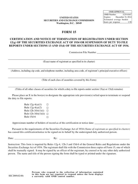 This page provides links to pdf versions of sec public forms and many of the rules, regulations, and schedules associated with these forms. Web a form 15 with respect to securities being delisted may not be filed prior to the effective date of the form 25 for the delisting since sections 12(g) and 15(d) are suspended during the period in which section 12(b) applies. Until the termination of the section 12(g) registration is effective 90 days after the form 15 is filed (or such shorter period as the sec may determine), any It is used by companies to revoke. Sec form 15 is a voluntary filing with the securities and exchange commission (sec), otherwise called the certification and notice of termination of registration. The form is also used to provide. 20549 form 15 certification and notice of termination of registration under section 12(g) of the securities exchange act of 1934 or suspension of duty to file reports under sections 13 and 15(d) of the securities exchange act of 1934. Web sec form 15 is a voluntary filing with the securities and exchange commission (sec), also known as the certification and notice of termination of registration. Web form 15 is filed (assuming reporting obligations under section 15(d) are likewise suspended, as discussed below). Web sec form 15: This page provides links to pdf versions of sec public forms and many of the rules, regulations, and schedules associated with these forms.