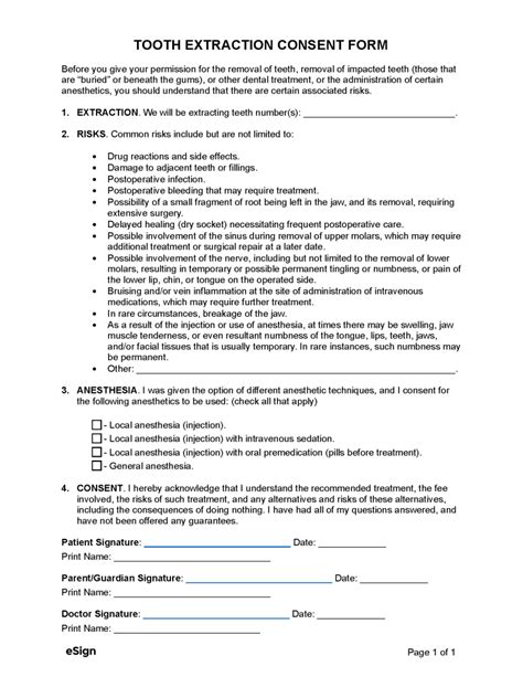 Occasionally during extraction or surgical procedures the sinus membrane may be perforated. Should this occur, it may be necessary to have the sinus surgically closed. No matter how carefully surgical sterility is maintained, it is possible, because Web oral consent is sufficient for most dental treatment; Web make sure that the informed consent process is carried out for every patient by having an office policy in place that is referenced and followed in every case. This discussion should be documented in the patient record. You have been advised by your dentist that you require the extraction of a tooth (removal). ________________________ bone grafting (applicable only if any graft is placed) the graft will be taken from or will be banked bone or bone substitute:. Used with permissions from tdic. It also gives the dentist permission to perform minor restorative procedures, administer local anesthesia, and bill the patient’s insurance company.