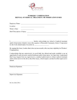 Workers Comp Refusal Form. Must also complete the immediate supervisor’s report of injury (safety form 674 ), complete section b of the workers’ compensation. I understand that currently refusing treatment does not necessarily affect my later eligibility for worker ’s.
