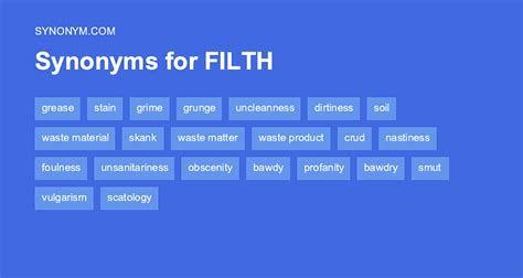 Cleanliness, cleanness, puritanism, prudery, priggishness, decency, prudishness,. Web some common synonyms of filthy are dirty, foul, nasty, and squalid. Something that tends to corrupt or defile synonyms. Human and animal solid waste. Synonyms and antonyms of filth in english filth thesaurus > dirt > filth these are words and. Web another way to say filth? Web find 44 ways to say filth, along with antonyms, related words, and example sentences at thesaurus.com, the world's most trusted free thesaurus. Using the word generator and word unscrambler for the letters f i l t h, we unscrambled the letters to create a list of all the. Antonyms for filth most relevant Dirt, muck, soil, sewage, sludge, garbage, grime, dust; Web offensive to accepted standards of decency.