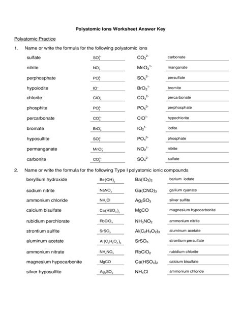 Many occur in families of names. Polyatomic ions have characteristic formulas, names, and charges that should be. R ey matching the horizontal' and vertical axes, write the formulas of the compounds with the following. Web writing formulas with polyatomic ions. Worksheet that can be used to test a students knowledge of the. Writing formulas with polyatomic ions. Web this a worksheet best used for grade 9, 10, and 11 students who study chemistry.the worksheet mainly deals with naming polyatomic ionic compounds and writing chemical. In this article, we will discuss polyatomic ions. This interactive powerpoint teaches students how to write formulas and name formulas for compounds with polyatomic ions. Web live worksheets > english > science > chemistry > naming compounds with polyatomic ions. Polyatomic ions there are many polyatomic anions.